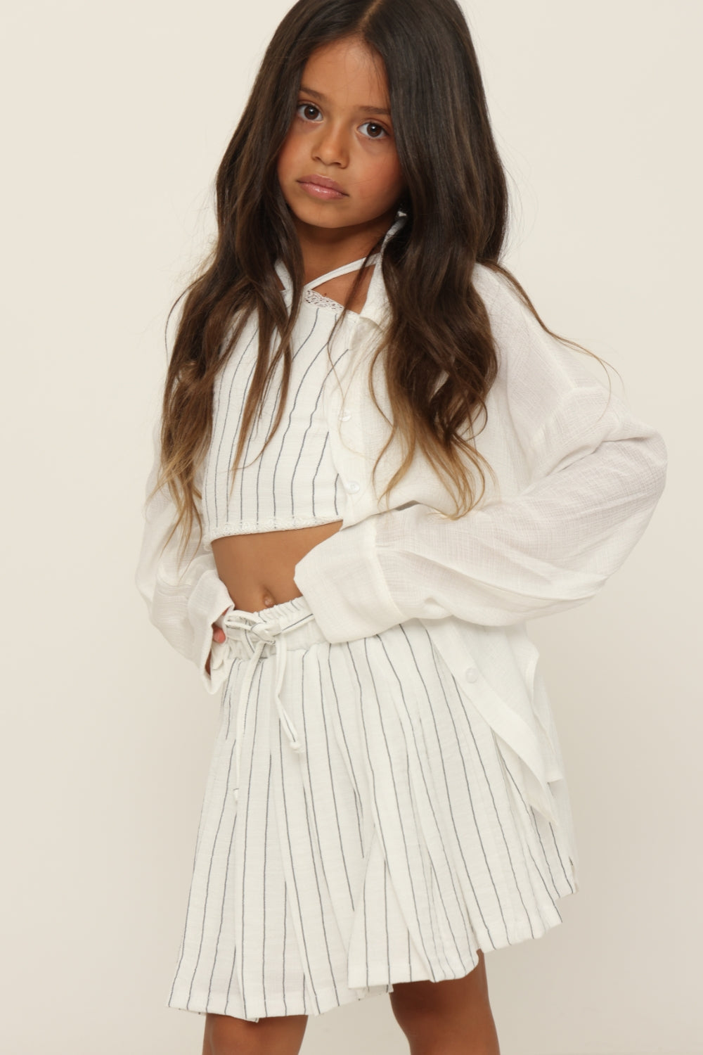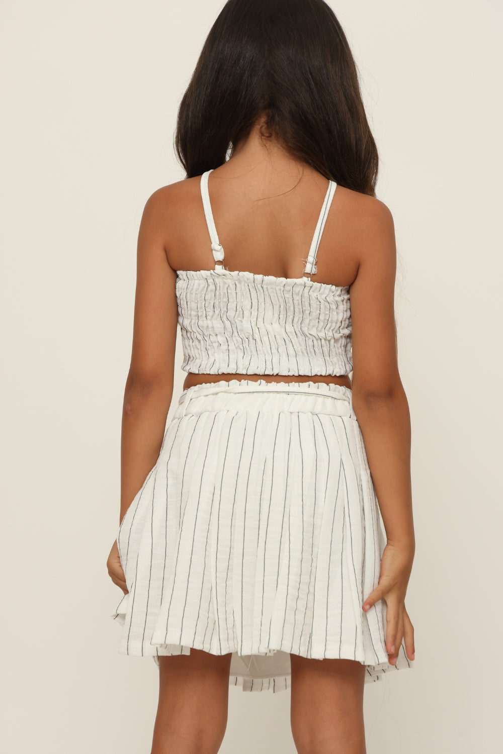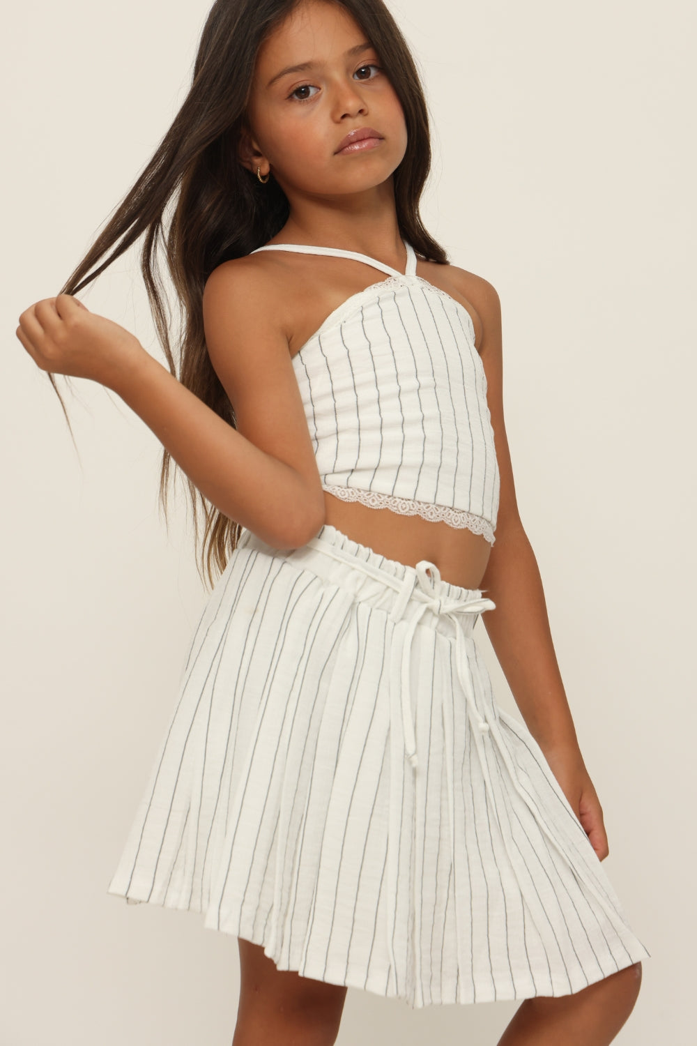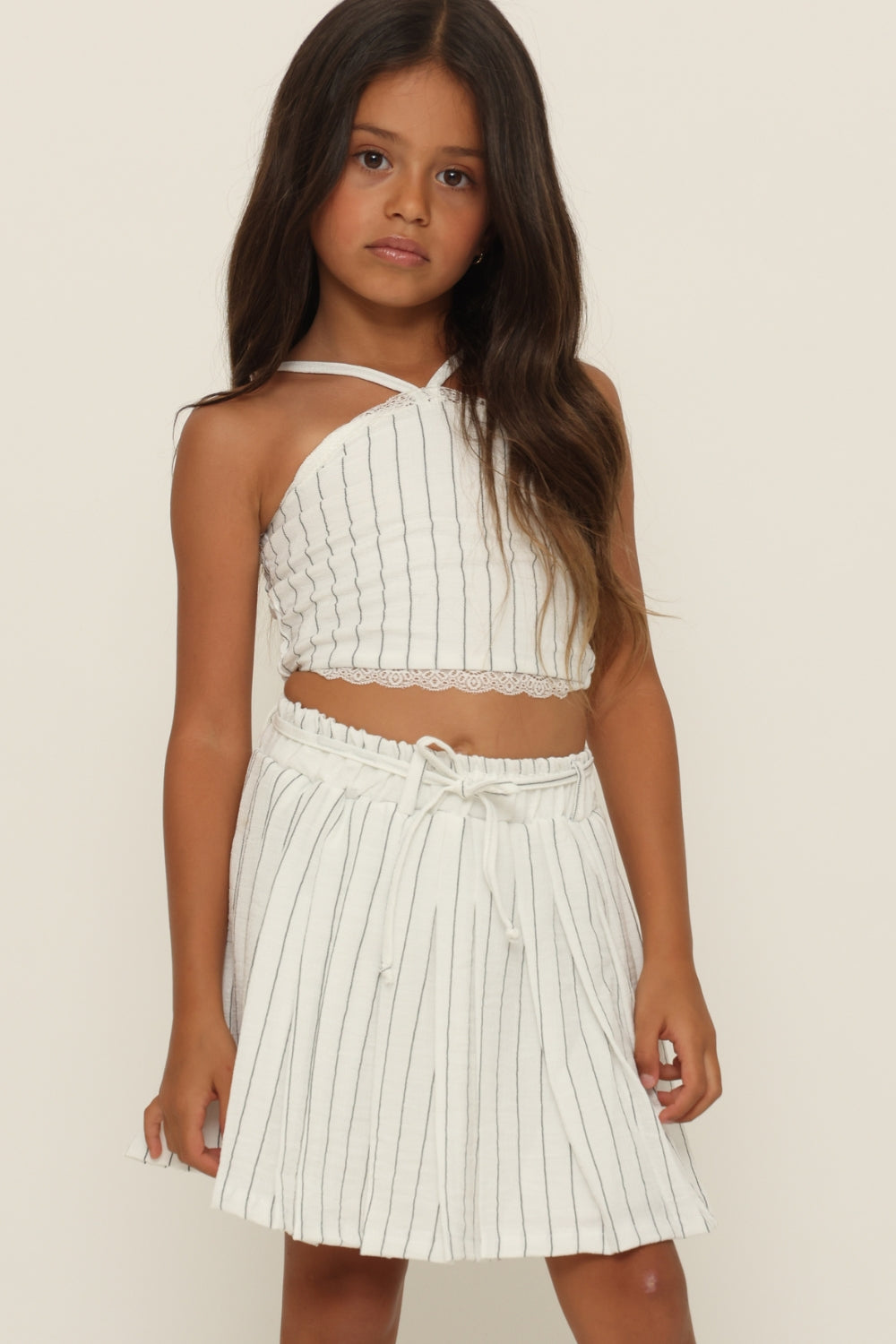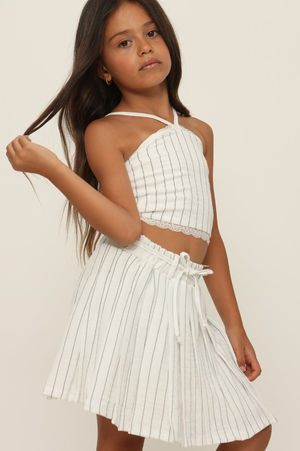 חליפת פסים מחוך עם חצאית כפלים.משולב תחרה