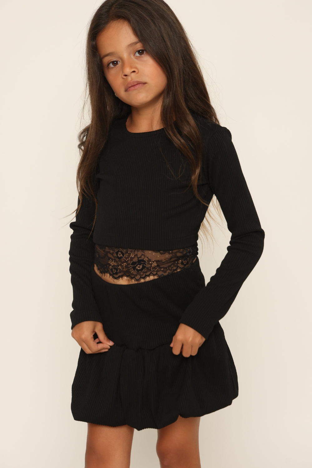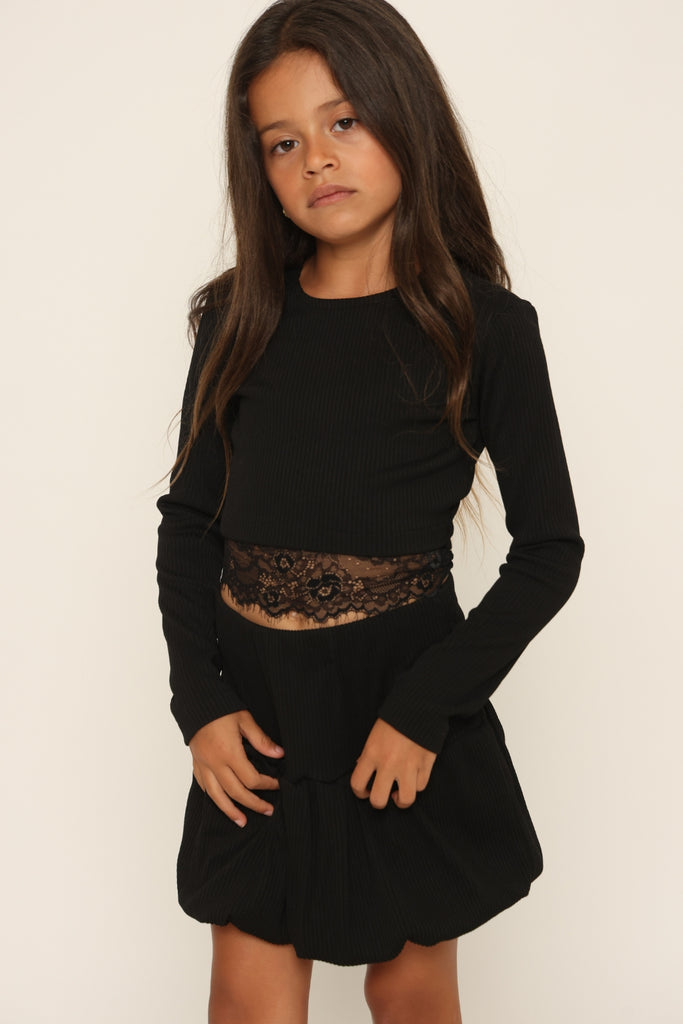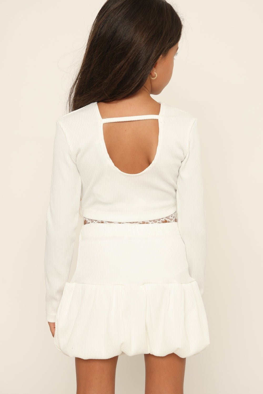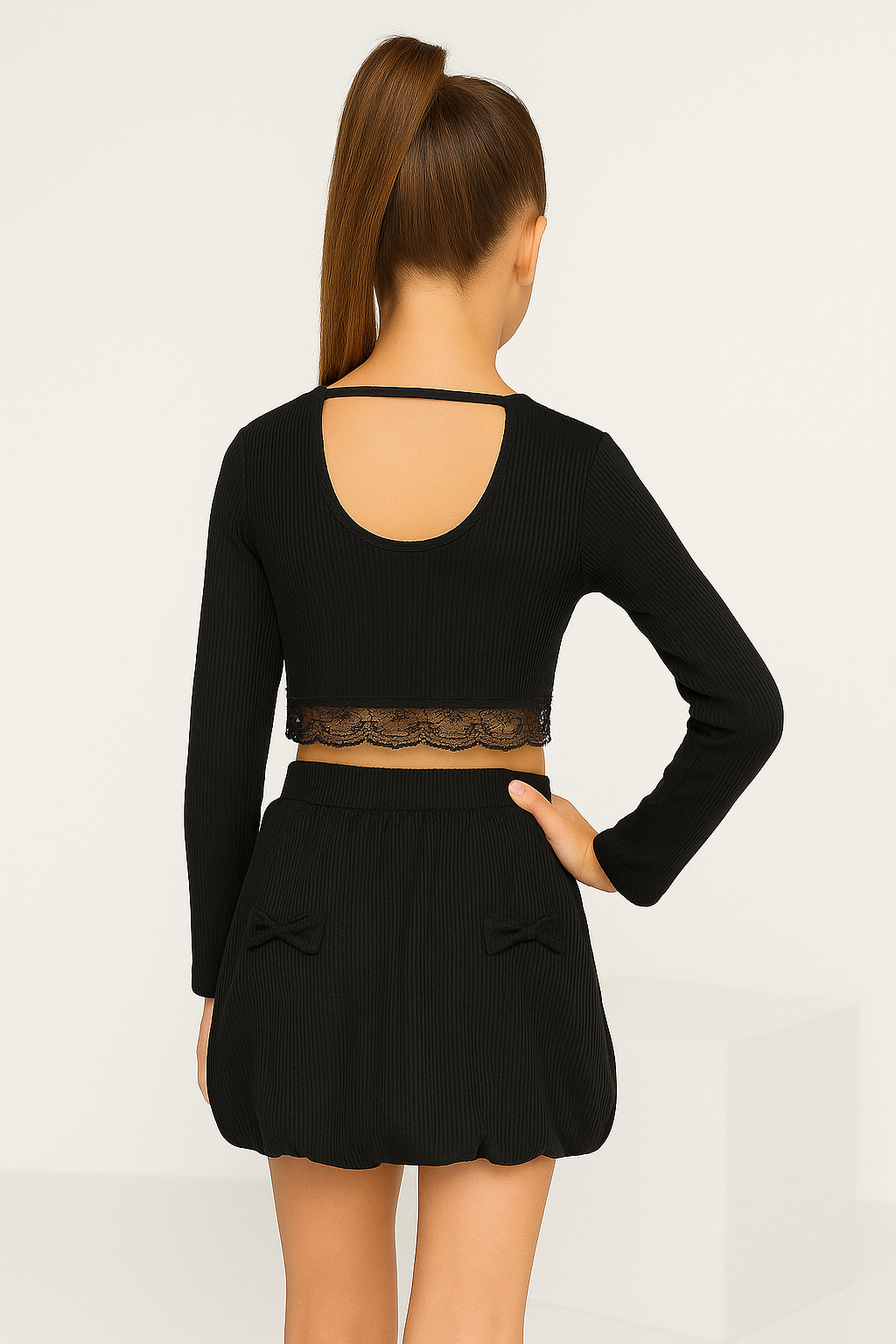 סט חצאית בלון עם פפיונים חולצה גב חשוף  משולבת תחרה