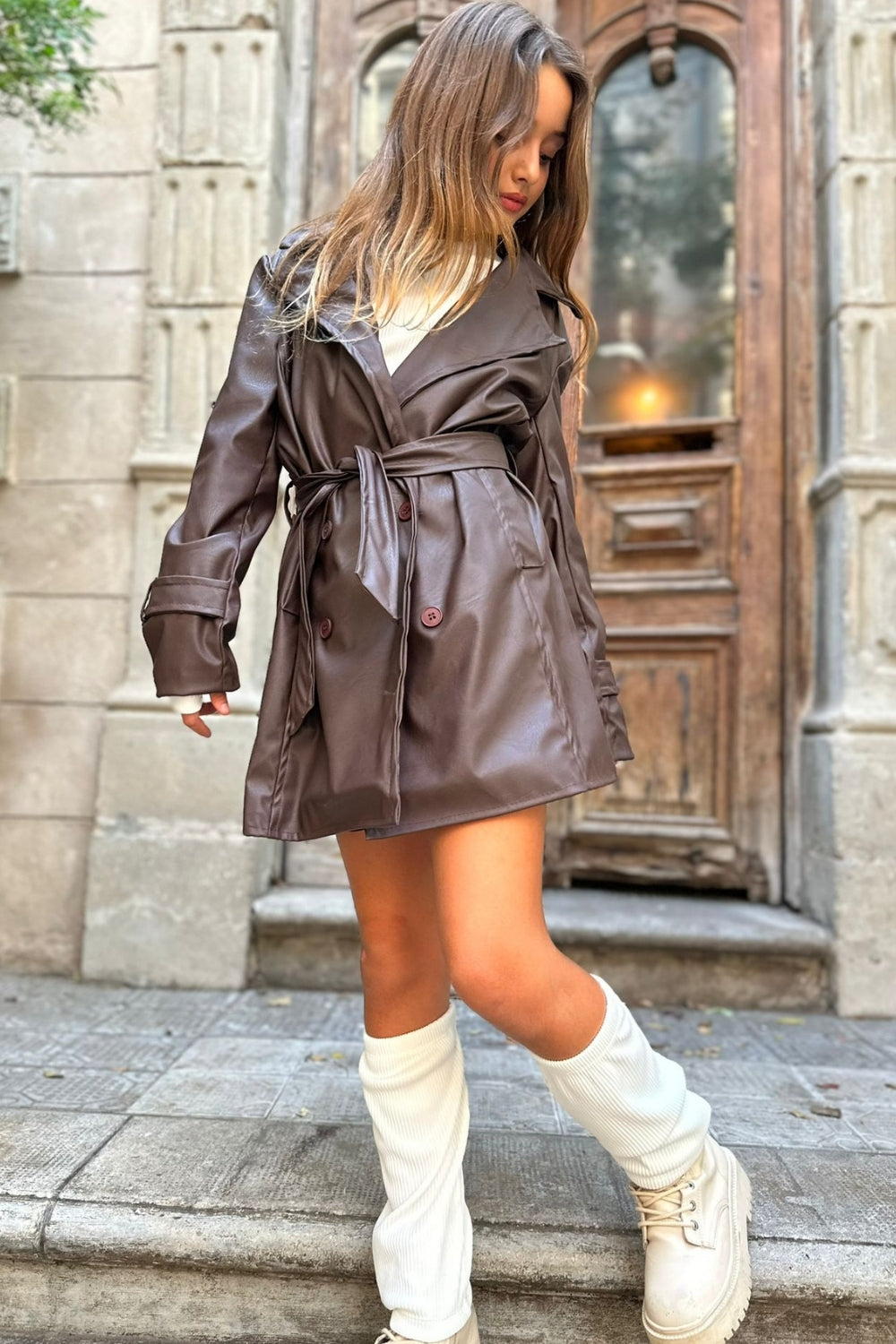 ג'קט דמוי עור עם קשירה וכפתורים לוק טרנדי.