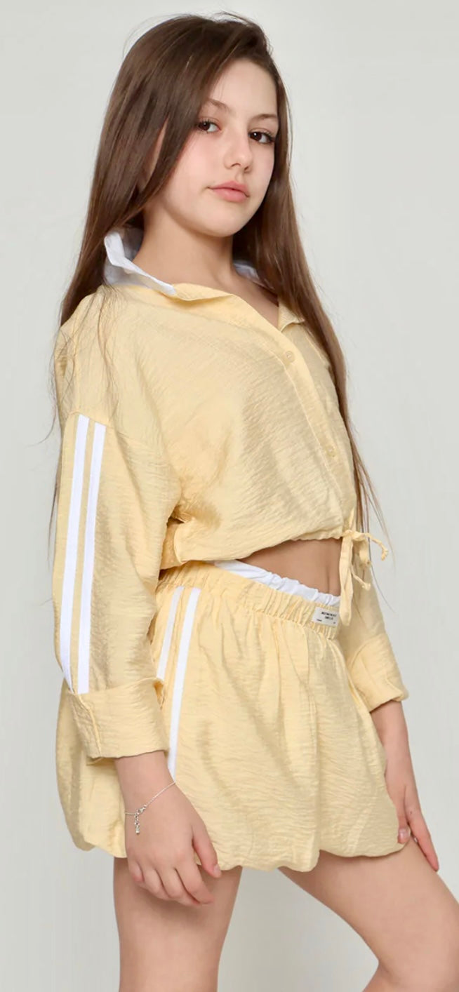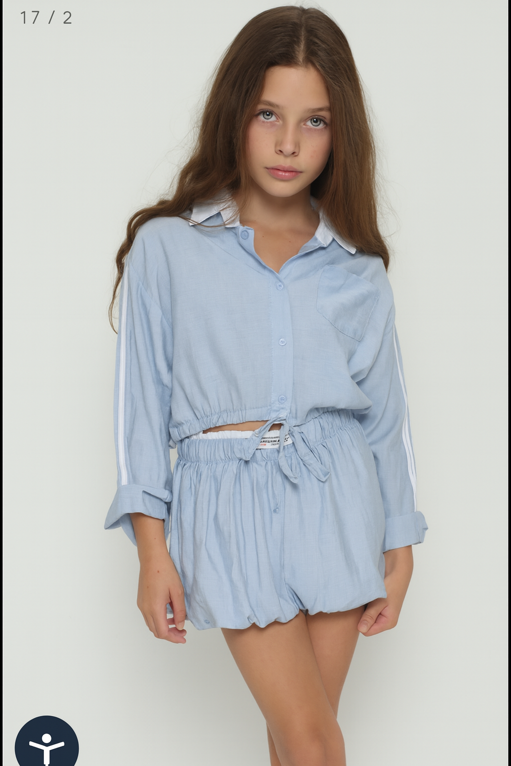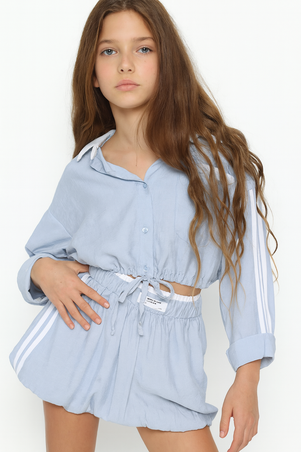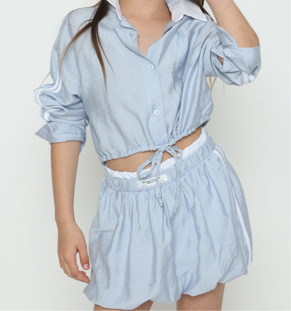סט חולצה מכופתרת בגזרת קרופ עם צוארון לבן וסרטים בשרוול , חצאית בגזרה בלון עם סרטים בצד