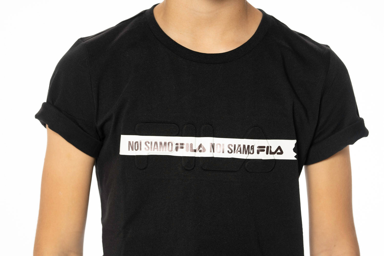 • חולצת טי שירט לבנים של חברת FILA עם כיתוב בחזית הבגד